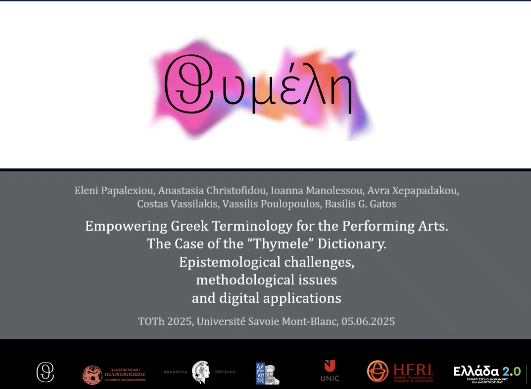 Papalexiou, Eleni & A. Christofidou & I. Manolessou & A. Xepapadakou & C. Vassilakis & V.  Poulopoulos & B.  Gatos. « Renforcer la Terminologie Grecque pour les Arts de la Scène : Le Cas du Dictionnaire Thymèle. Défis épistémologiques, enjeux méthodologiques et applications numériques », International Conference TOTh 2025, Université Savoie Mont-Blanc, 05-06.06.2025.